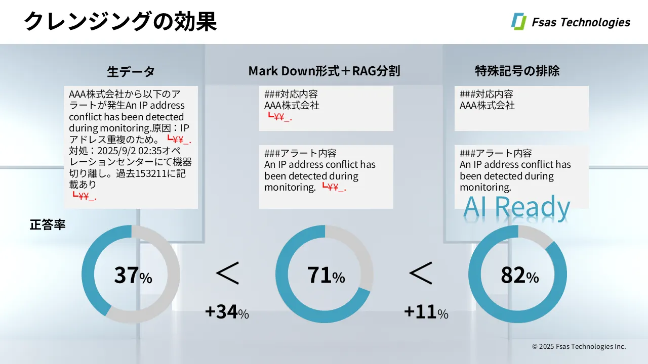 生データをそのまま利用した場合の回答精度は37%に留まりましたが、マークダウン形式およびRAG分割による階層化されたデータにクレンジングを行うことで71%へ向上、さらに、特殊記号(「#」「-」など)の排除によって、現在は82%の回答精度を達成しております。