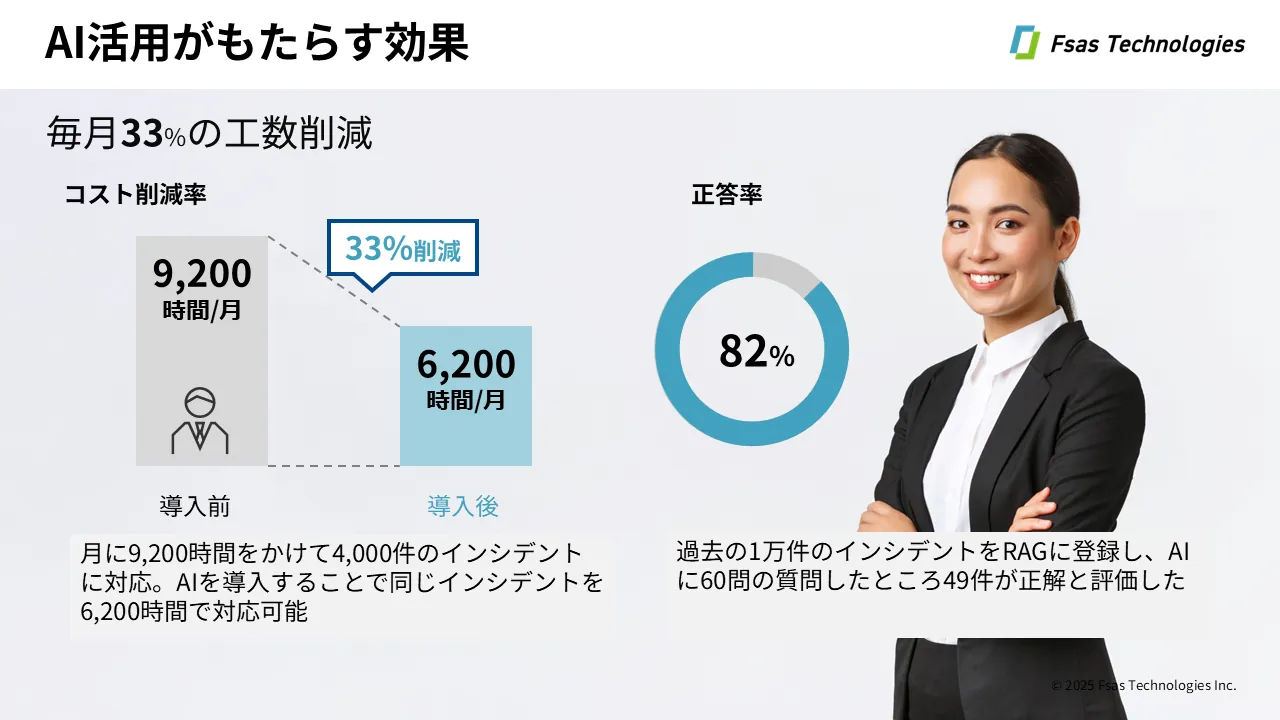 現在、当社のサービスデスクでは月間9,200時間を費やし、約4,000件のインシデントに対応しています。このAIアプリの導入により、同等のインシデント処理を6,200時間で処理することが可能となり、月間33%の工数削減を見込んでおります。